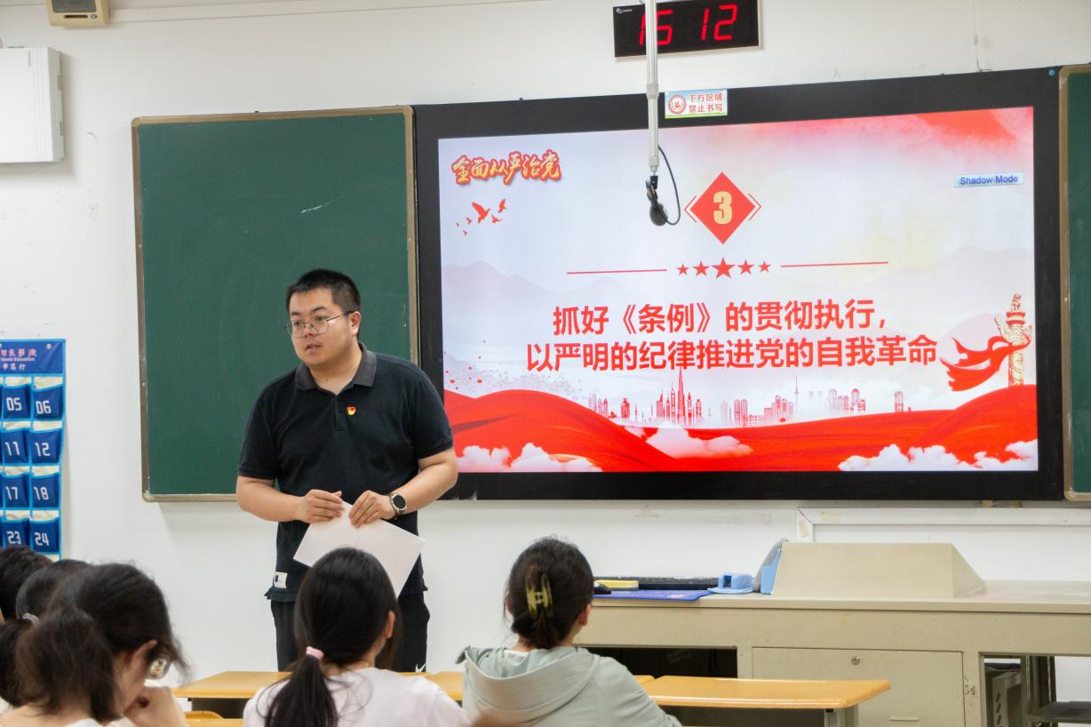 员工第一党支部书记杨菊鑫老师以《全面从严治党永远在路上 党的自我革命永远在路上》为主题开展授课。杨菊鑫老师给党员同学们具体阐述如何遵守党规党纪,引导员工党员深入了解《中国共产党纪律处分条例》的具体内容。同时,他着重强调了党员同学要谨言慎行,倡导节约、反对浪费,严守规矩与纪律,树立良好的模范带头作用,以严明的纪律推动党的自我革命,不断提升自身的政治素养和拒腐防变能力。