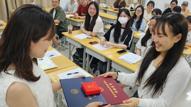 班会伊始,班主任们有的以一段深情的寄语开启了这场特殊的班会,有的回顾了同学们四年来的成长与变化。班主任和辅导员们一样,看着同学们一天天成长,都感到无比欣慰与自豪。每一位从班主任手中接过毕业证、学位证的毕业生,会与老师情不自禁相互拥抱和祝福,眼中闪烁着感激的泪光。