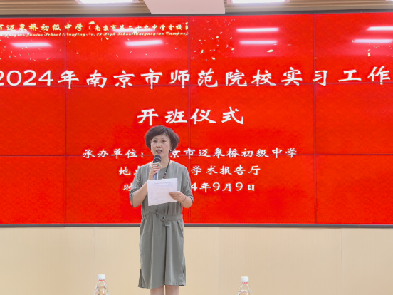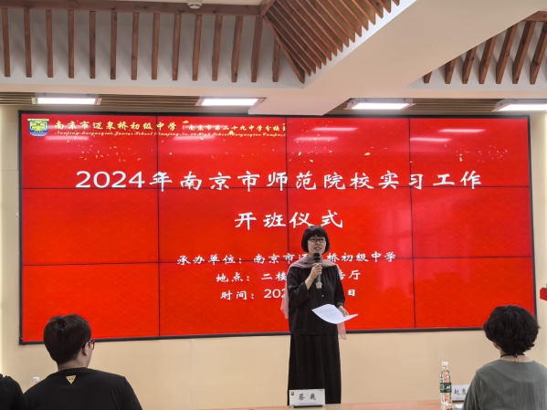 南京市迈皋桥初级中学梁晓燕董事长在讲话中,希望接下来的实习生活能成为教坛新兵们的最美好的一段时光。她与全体实习生就“善为师者,既美其道,又慎其行”进行了分享,强调在校园中,作为老师要注重衣着行为。此外,梁董事长还强调“爱是教育的一切出发点和基石”,鼓励实习生要传递给孩子们纯正、纯美、纯善,不负这段实习时光。梁董事长还认为,“人生天地间,各自有禀赋。为一大事来,做一大事去”,告诉实习生们要珍惜这段实习时光,明确自己的责任和担当。