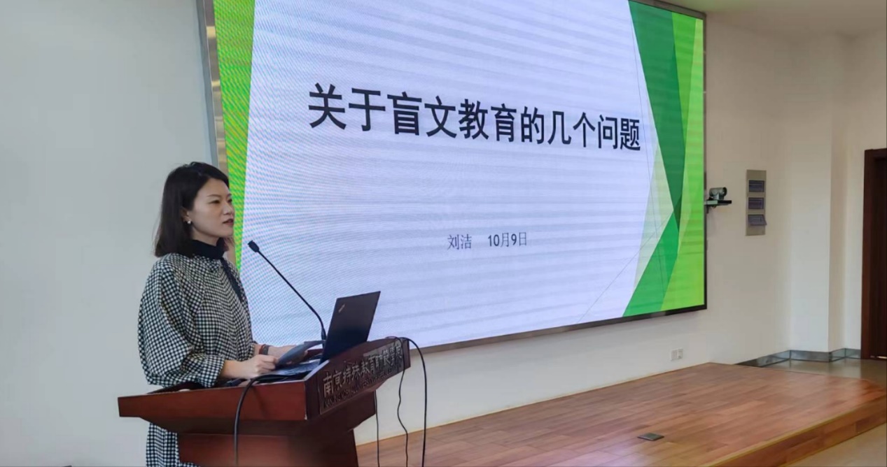 刘洁博士主要介绍了盲文和手语的重要性以及它们在国家通用语言文字中的地位,以及相关的政策和法规、视力残疾和听力残疾人的人员的普及水平测试管理办法,其中特别提到中国盲人民族器乐符号的出版以及对中医和其他专业书籍的盲文化需求。