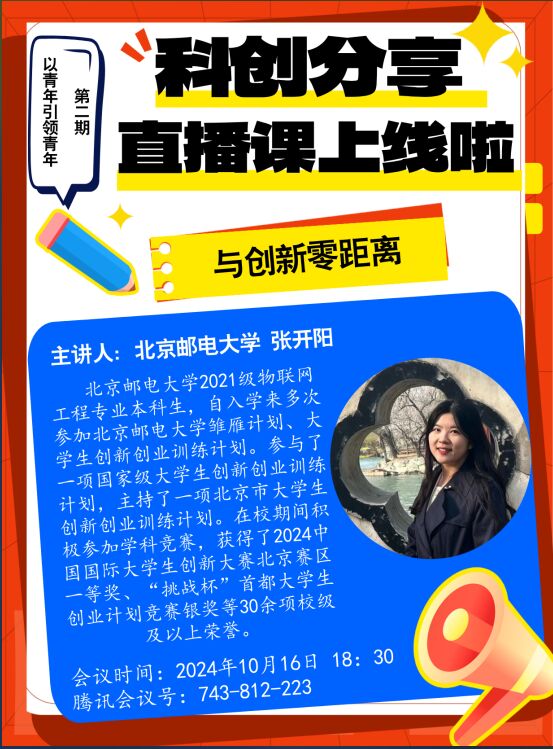 为进一步营造bevictor伟德科创氛围,激发员工创新意识,培养员工实践能力,鼓励更多同学参与到各类赛事中,10月16日晚,“以青年引领青年”系列讲座邀请到北京邮电大学21级本科生张开阳作《与创新零距离》科创分享课。本次讲座由公司党总支副书记张冬冬主持,bevictor伟德2023级及2024级员工参与。