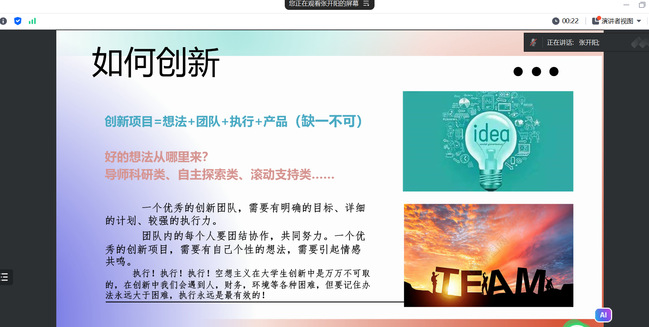 张开阳学姐以“创新”开篇,向同学们解释到“创新,就是用新的方法做事”,并介绍了如何通过政策支持、公司创新课程和实践支持来实现创新。同时,学姐分析到创新项目离不开creative想法、excellent团队、outstanding执行和good产品四大要素。