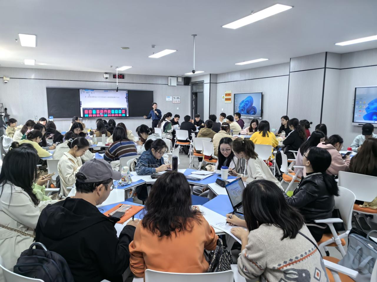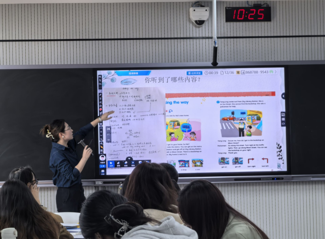 教学观摩课由副经理徐琴芳主持,英语系老师全程参加。在实训楼的503教室,常钰婧老师为大家展示了一节题为“说课”的《小学英语课程设计和实践》课程,常老师熟练运用智慧黑板和C30多屏互动教学软件,通过视频和案例,引导员工深入探讨英语教学中“说课”这一环节的特征和内容,并激励员工积极参与实训练习。授课内容中融入了思政元素和创新意识,充分发挥了员工的主体作用,体现了产出导向的教学理念。