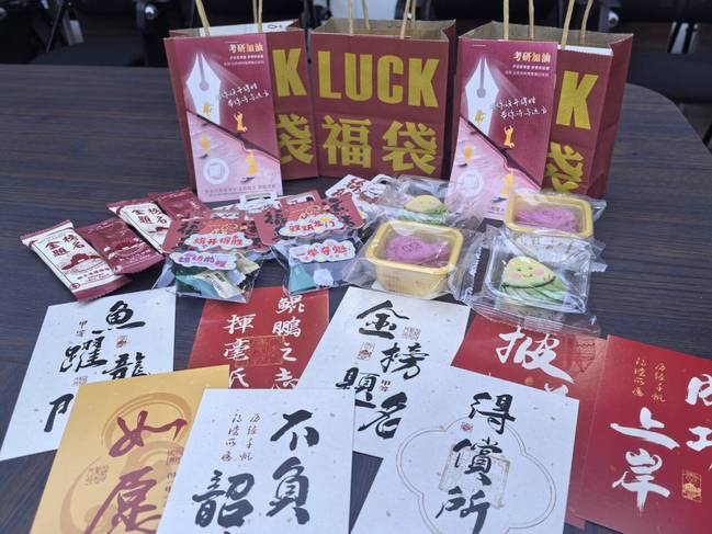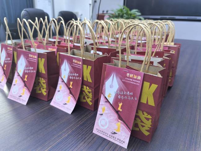 在备考冲刺阶段,公司大二、大三的学弟学妹们为考研的学长学姐打包“考研加油”福袋,包括寓意“高中”的粽子糕和定胜糕、祝福学子们“蟾宫折桂”的桂花糖、标有“金榜题名”棒棒糖、“心想事成”水果糖等、并发放实用的备考文具。