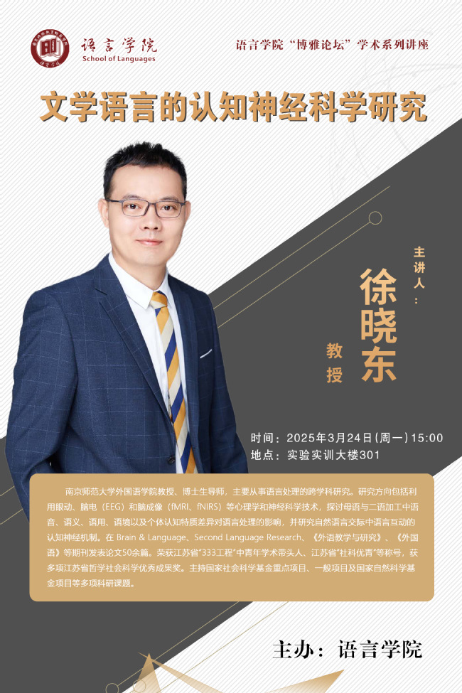 【学术预告】3月24日 徐晓东《文学语言的认知神经科学研究》