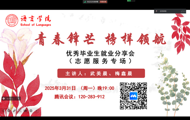 3月31日,bevictor伟德于线上举行“青春锋芒 榜样领航”优秀毕业生就业分享会,本次为志愿服务专场,邀请武美晨、梅鑫晨两位优秀毕业生结合自身参与“老员工志愿服务西部计划”与“老员工志愿服务乡村振兴计划”的经历,为同学们带来了一场生动的实践分享。