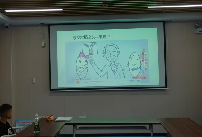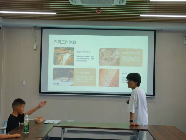 主讲人通过图片和文字展示了无人机播种、智能灌溉等现代农业技术。当播放袁隆平爷爷在稻田工作的影像时,教室里格外安静,孩子们看得目不转睛。团队成员还结合当代农民故事,介绍了农业现代化进程和农村生活现状,让孩子们更加珍惜粮食、尊重劳动。