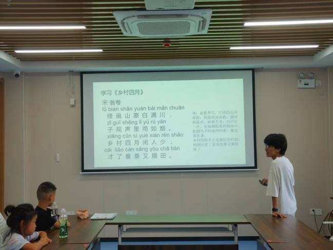 主讲人带领同学们品读了《悯农》和《乡村四月》两首经典作品。通过分析锄禾日当午的铿锵节奏和绿遍山原的优美韵律,生动展现了农耕劳作的艰辛与诗意。引导孩子们体会诗词中对劳动人民的礼赞。