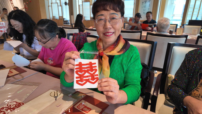 剪纸过程中,老人们互相交流,共同学习,团结协作。纸张在老人们灵活的手中翻转、折叠,剪刀起起落落间图案就已成型。在志愿者的帮助下,老人们将剪纸装裱在相框中,纷纷对着镜头展示学习成果。