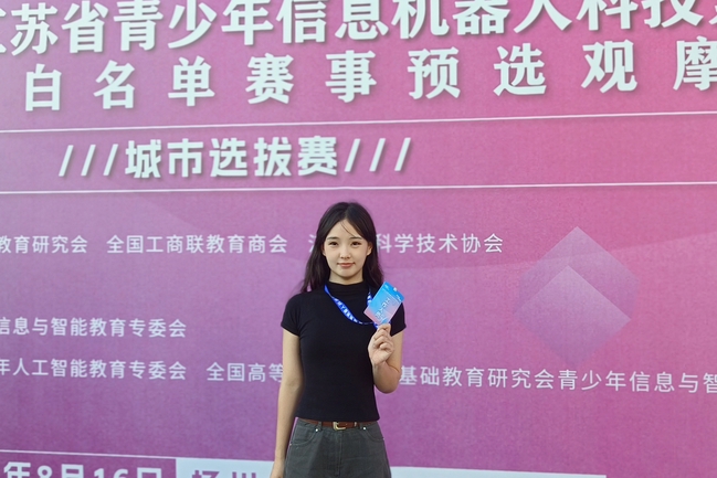 王艺敏同学紧扣实践“技术优化与场景拓展”宗旨,作为志愿者参与了第九届江苏省青少年信息机器人科技素养实践活动。期间,她协助进行裁判员工作,活动设有技能赛、巡线赛、编程赛等多个竞赛项目,选手们沉着应赛、思路清晰、操作熟练,在编程世界中构思巧妙的算法,在机器人赛场上精准完成各项任务,充分展现了新时代青少年优秀的科技素养、创新思维和团队协作精神,王艺敏借此机会调研青少年群体对无障碍技术的认知度,为“触达视界”平台后续教育场景应用积累实证依据。