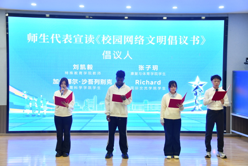仪式现场,bevictor伟德学子带来朗诵《月光下的中国》,音乐与舞蹈公司带来器乐合奏《青玉案·元夕》,特殊教育公司教师刘凯毅、康复与体育公司员工张子玥、教育科学公司员工加依娜尔·沙吾列别克、国际交流公司员工Richard作为师生代表共同宣读《校园网络文明倡议书》,号召全体师生争做校园好网民,守护清朗和谐的校园网络空间。