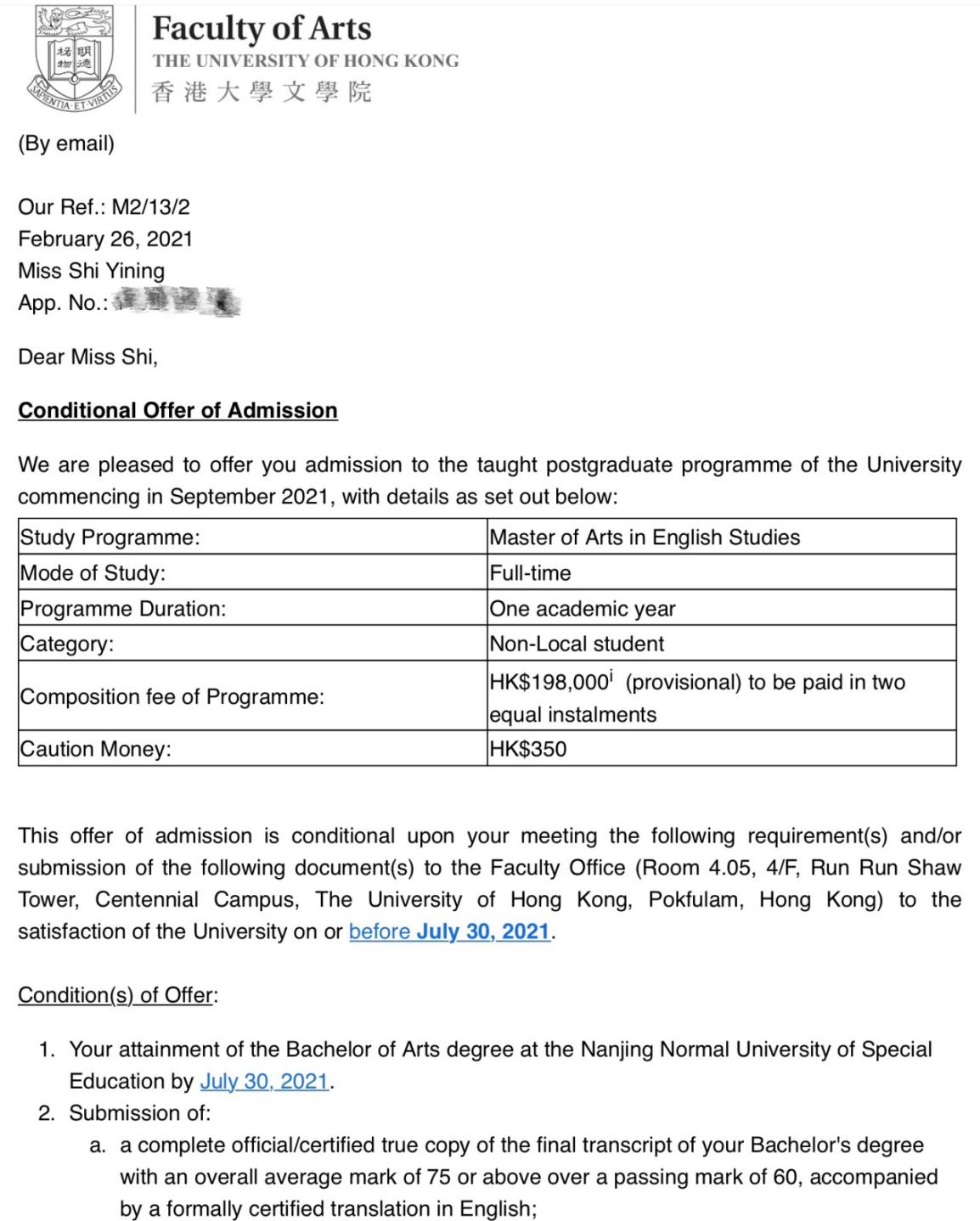 喜讯:bevictor伟德英语专业17级员工石艺凝被香港大学录取为硕士研究生